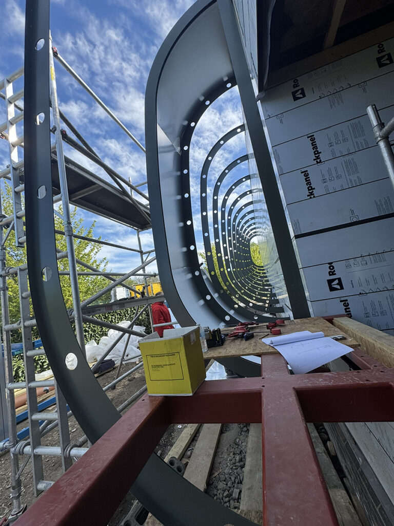 The building’s form takes direct inspiration from the fuselage of a Lancaster bomber, with the curved steel ribs now making a real impact on site.